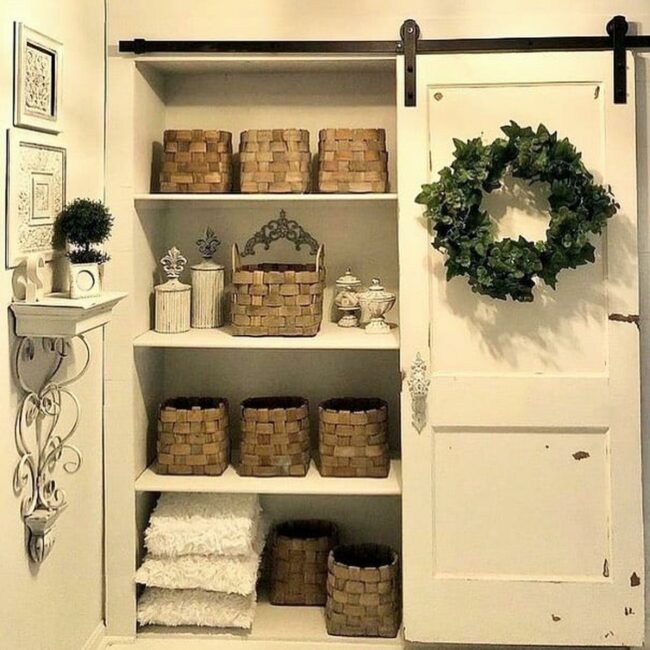 Textural elements like woven baskets provide visual interest and functional storage.