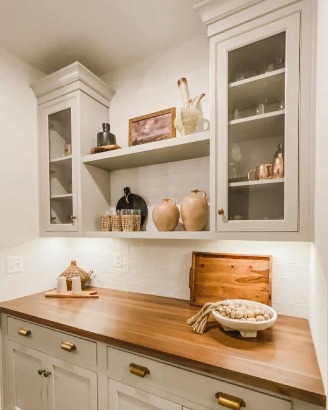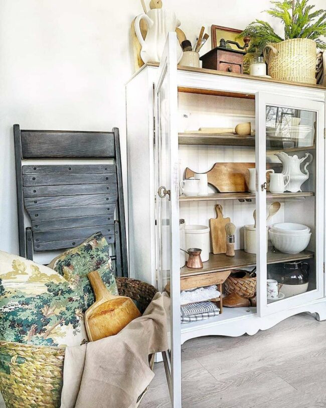 Displaying favorite mugs and plates behind glass doors elevates ordinary items into something extraordinary.