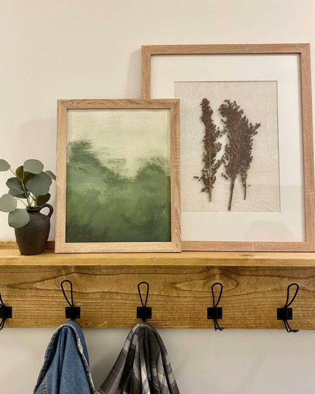Farmhouse style blooms in this charming coat rack display, where nature dances through delicate pressed flowers framed beside a quaint painting.