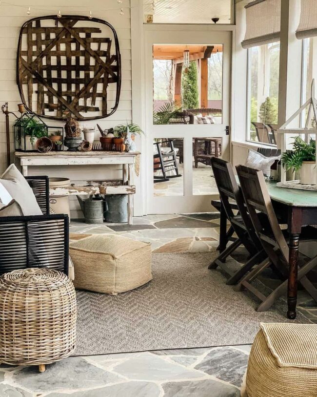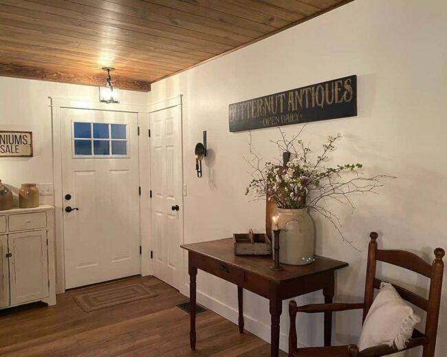 Rustic elements blend seamlessly, creating an inviting entryway that whispers countryside elegance.
