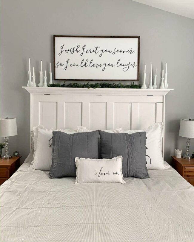Decorative candles and a lush green garland adorning the headboard add subtle sophistication to the space.