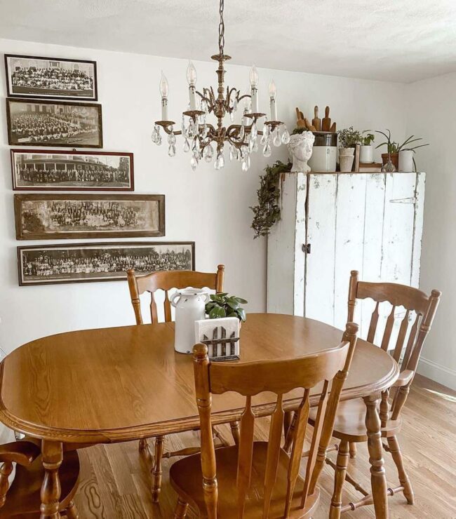 Rustic charm radiates through this vintage farmhouse kitchen, where framed photographs whisper family stories.