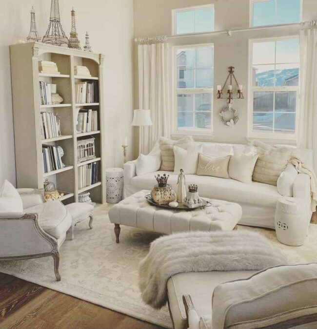 Crisp white and cream tones dance across walls and furnishings, softening edges and inviting relaxation.