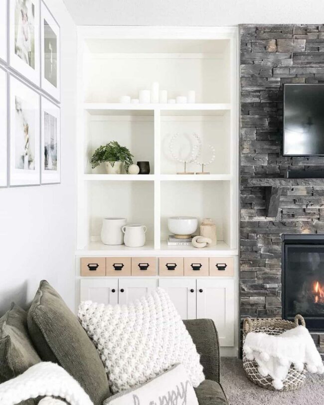 Stone fireplaces painted with subtle colors instantly capture attention, drawing eyes toward a charming wicker basket cradling a lush green plant.