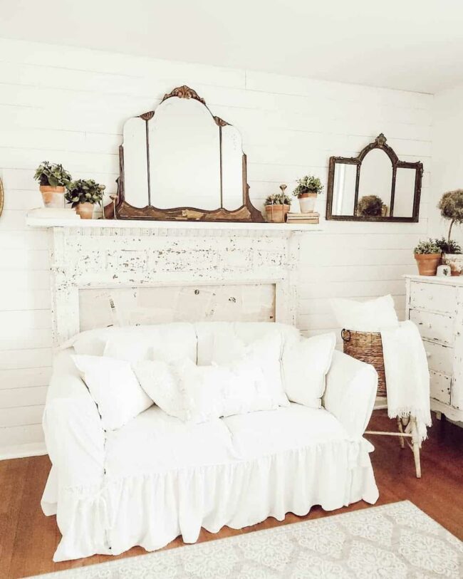 Eclectic artwork and mirrors dance across the mantelpiece, reflecting gentle light from delicate white candles.