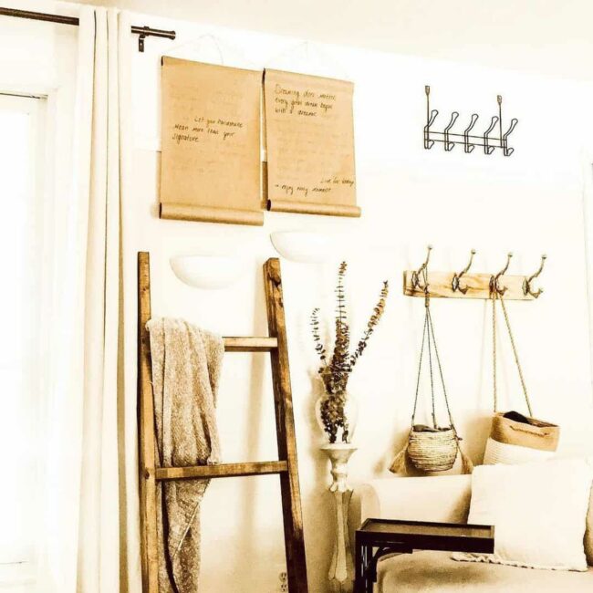 Wooden blanket ladders lean elegantly against walls, showcasing luxurious throws that welcome comfort into home spaces.