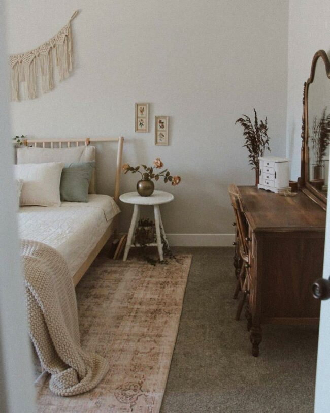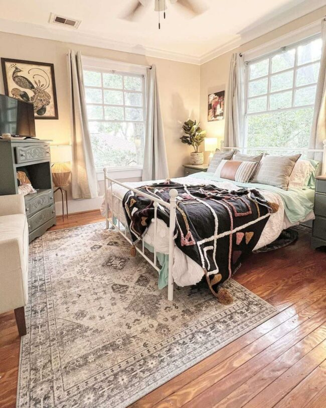 Boho bedrooms radiate pure comfort with a vintage white and gray rug anchoring the space's relaxed aesthetic.