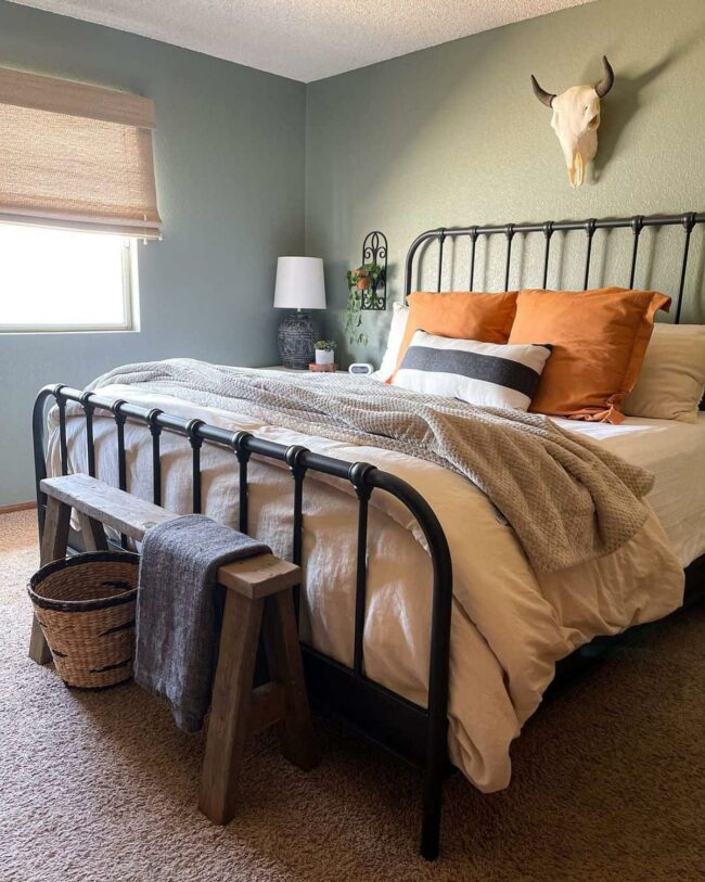 Burnt orange cushions splash vibrant energy across the bed, contrasting beautifully with the muted background.