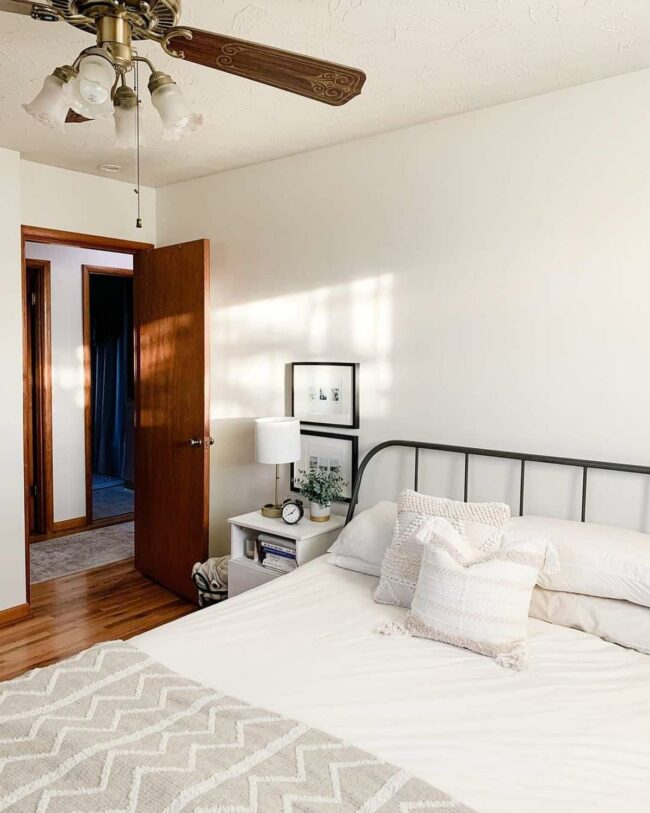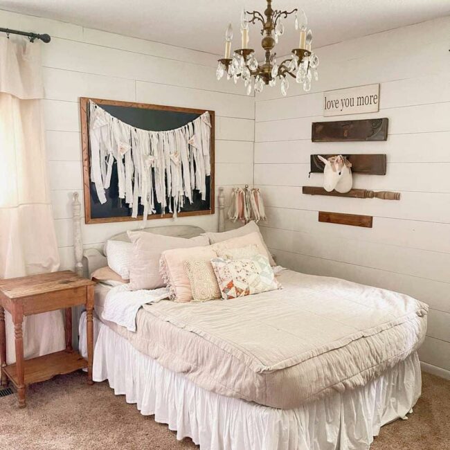 White shiplap walls embrace your senses in this farmhouse bedroom, creating an instant sense of calm and comfort.