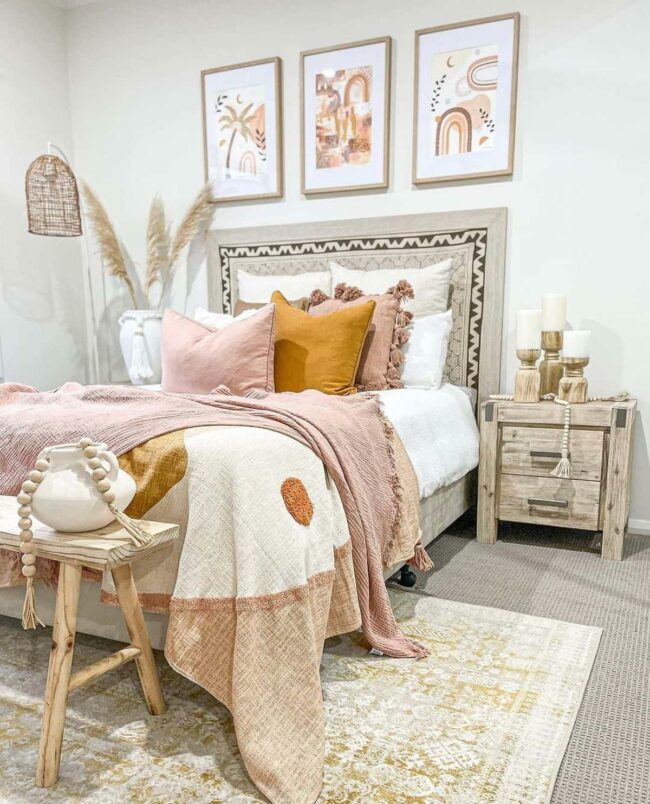 Boho farmhouse bedrooms capture hearts with mounted wood-framed posters that showcase rustic charm and personal style.