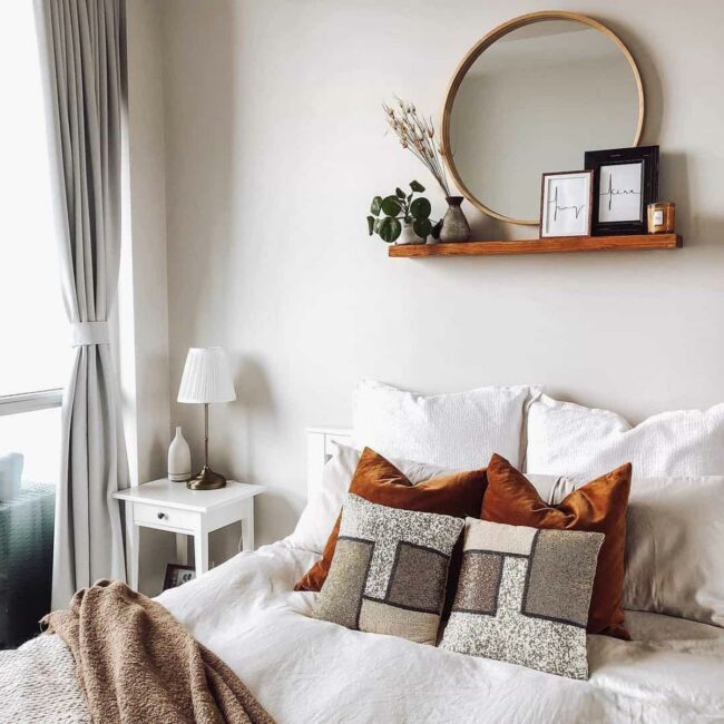 Warm wall decorations anchor the space, with a mounted mirror reflecting gorgeous natural light and creating visual depth.