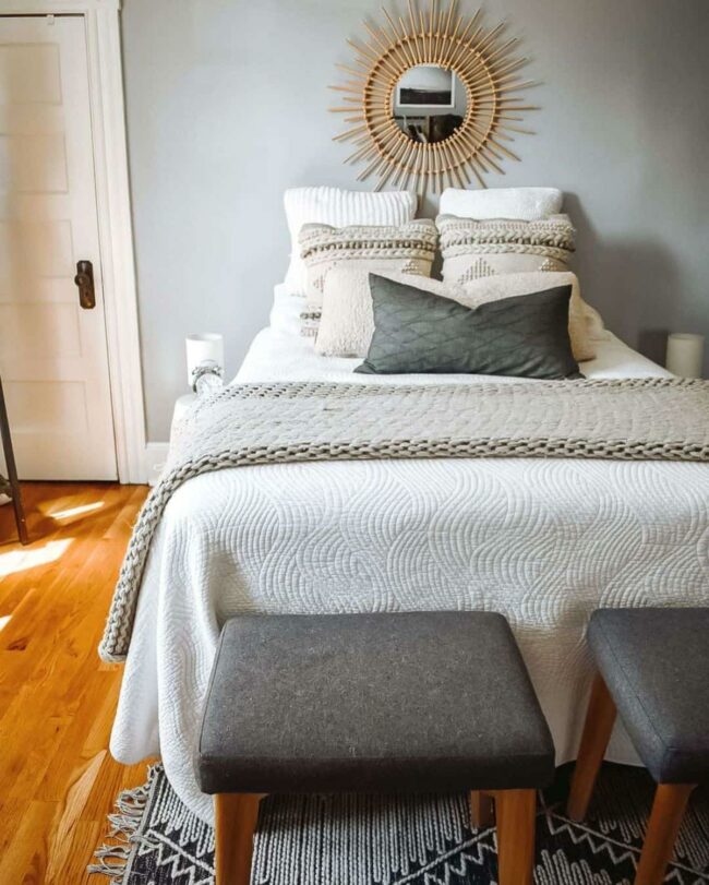 Sunburst mirrors make bold statements above beds, instantly drawing eyes with their radiant charm in gray farmhouse bedrooms.
