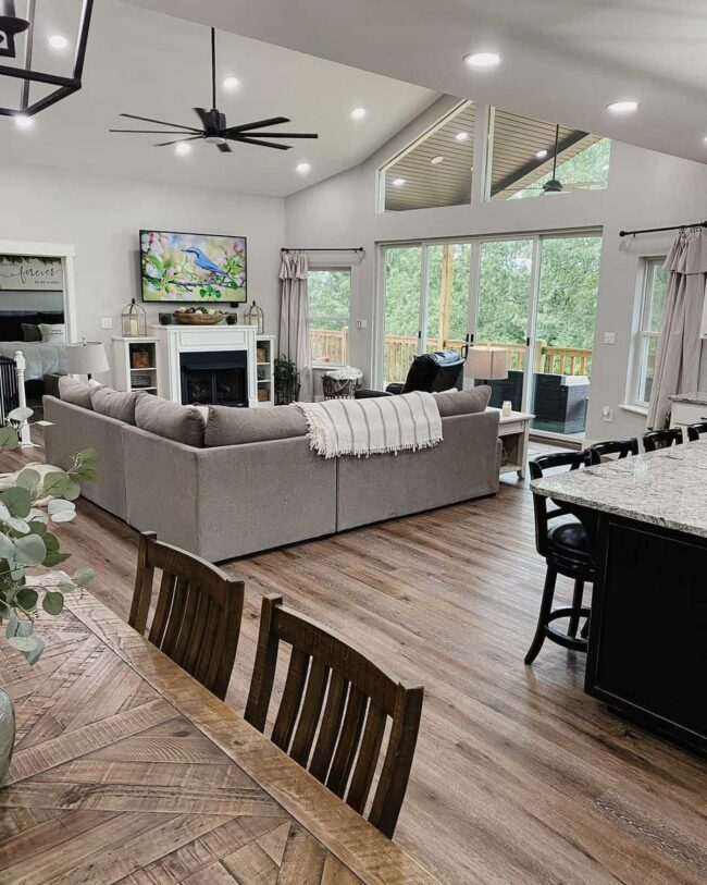 Light gray couches complement the wood tones, creating a harmonious palette that feels both sophisticated and approachable.