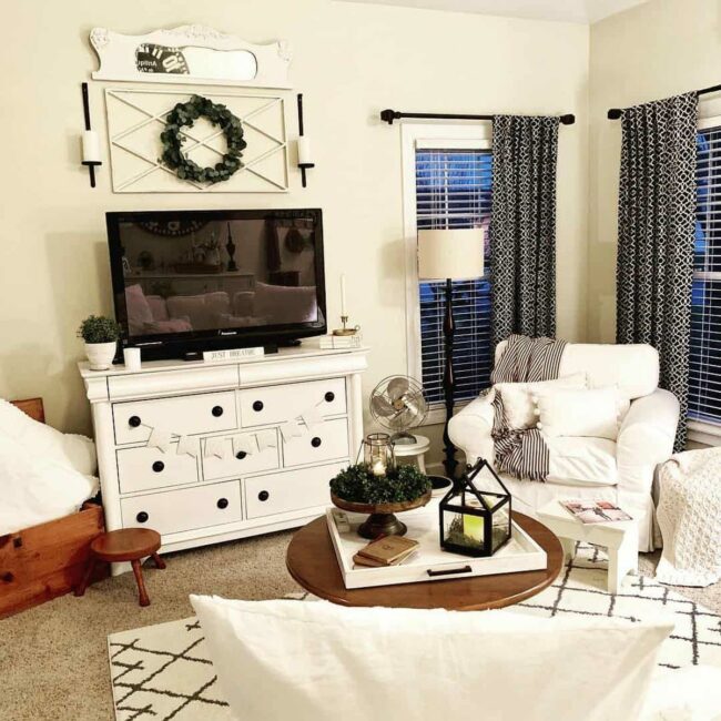 Black and white farmhouse curtains create a magnetic visual appeal in your living space, drawing eyes with their bold geometric patterns.