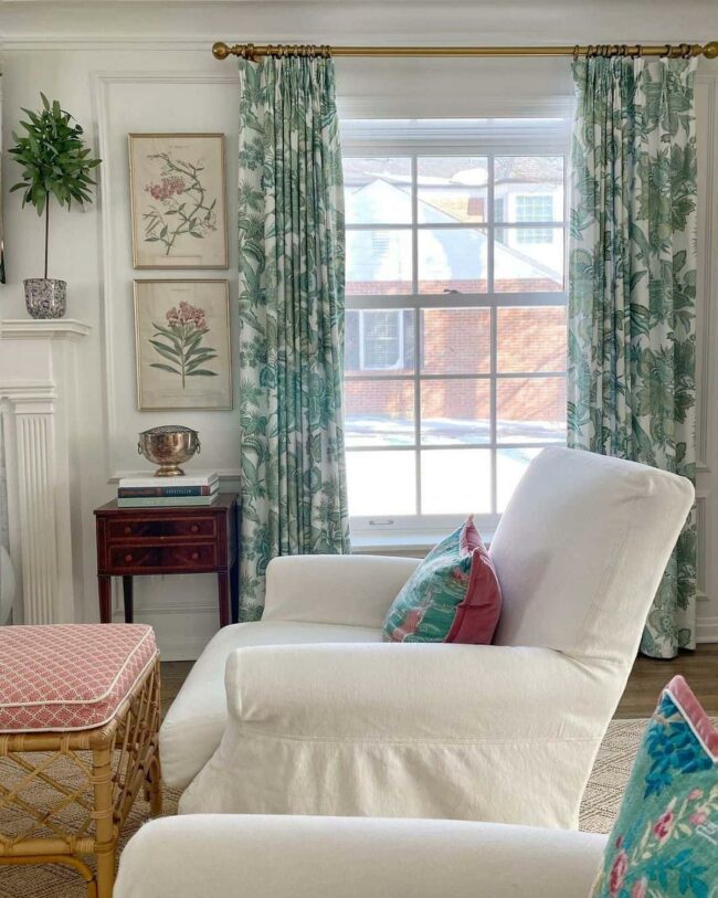 White and green floral curtains electrify living spaces with natural elegance, casting delicate shadows that whisper of outdoor beauty.