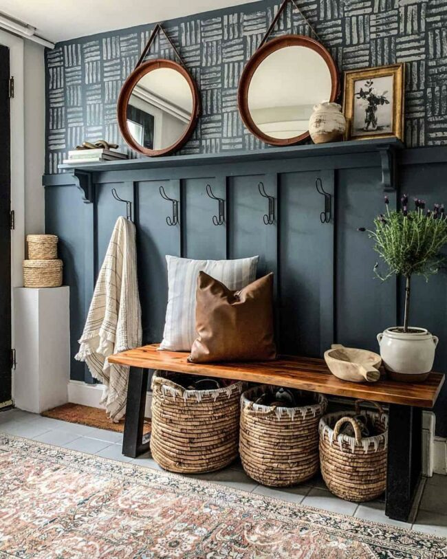 Dark blue board and batten wainscoting provides a stunning backdrop for matching wall shelves and black coat hooks.