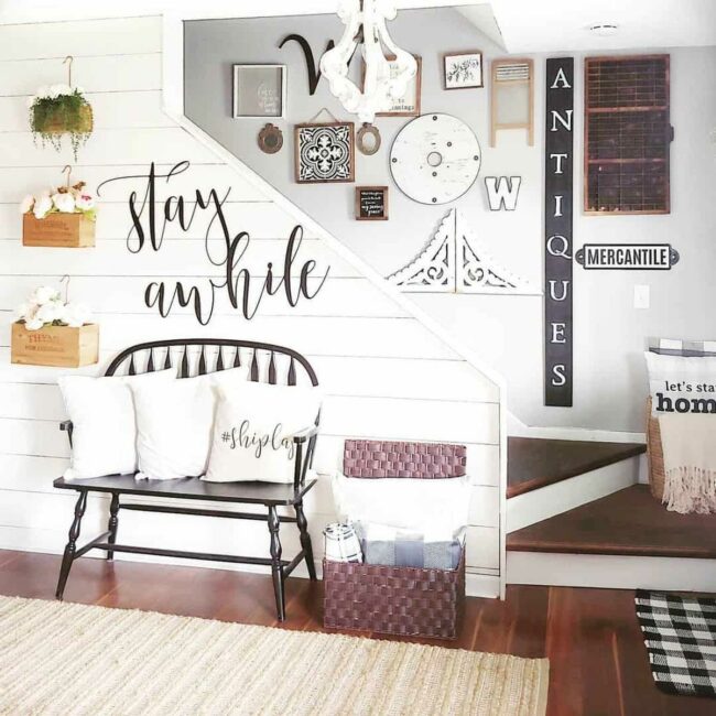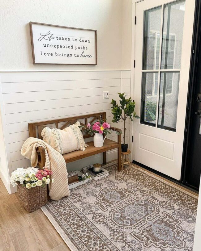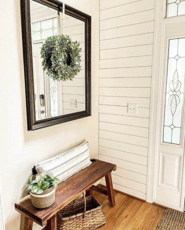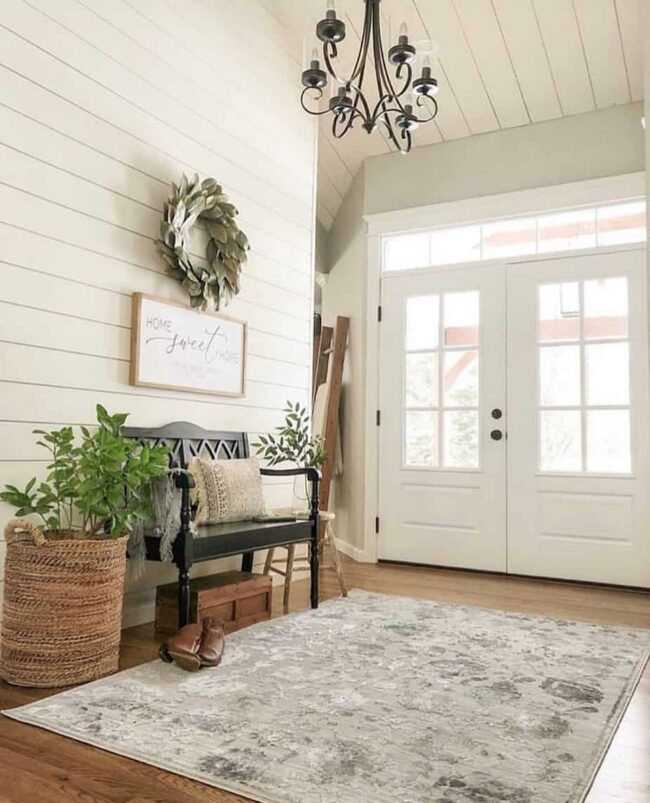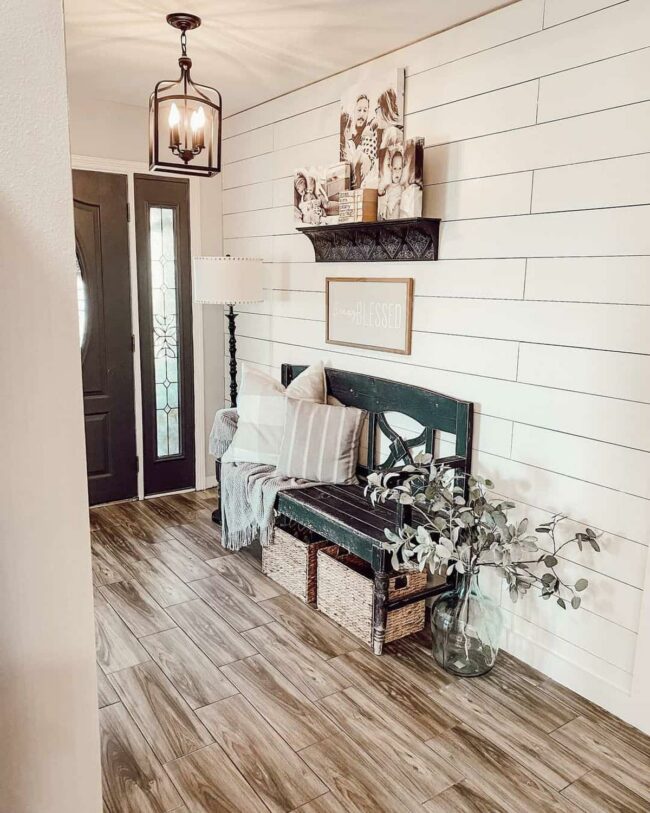 Farmhouse entryways radiate instant warmth with white shiplap wainscoting that sets a welcoming tone.