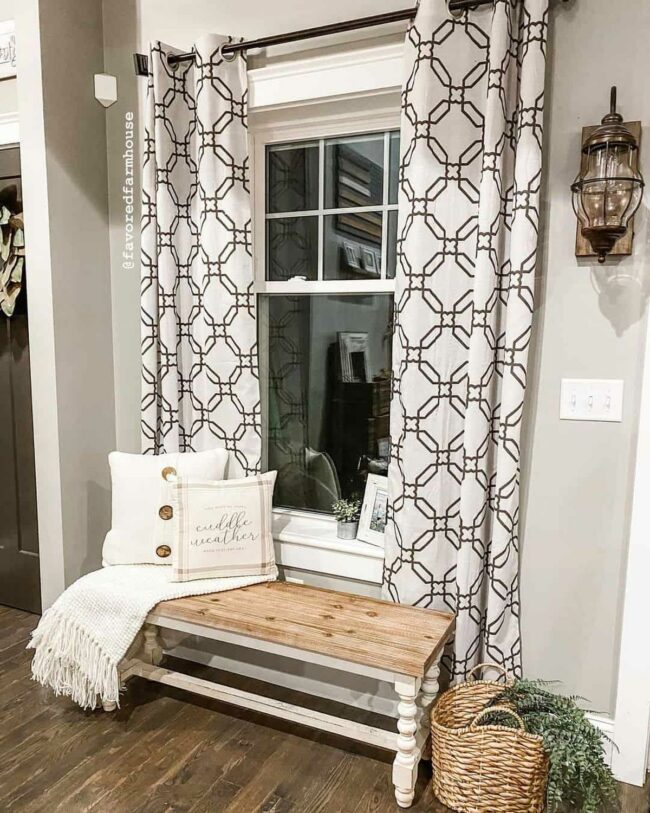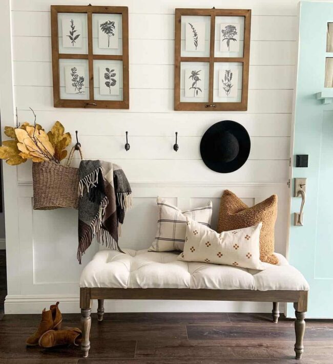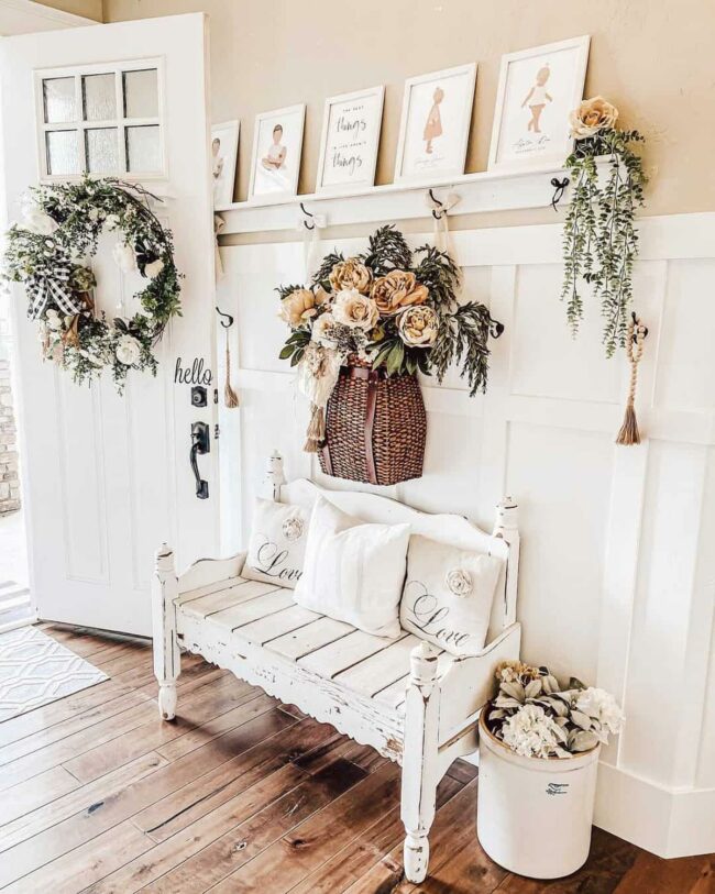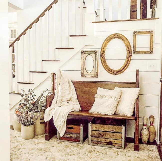 A farmhouse entry bench creates a cozy and inviting atmosphere the moment someone steps inside.