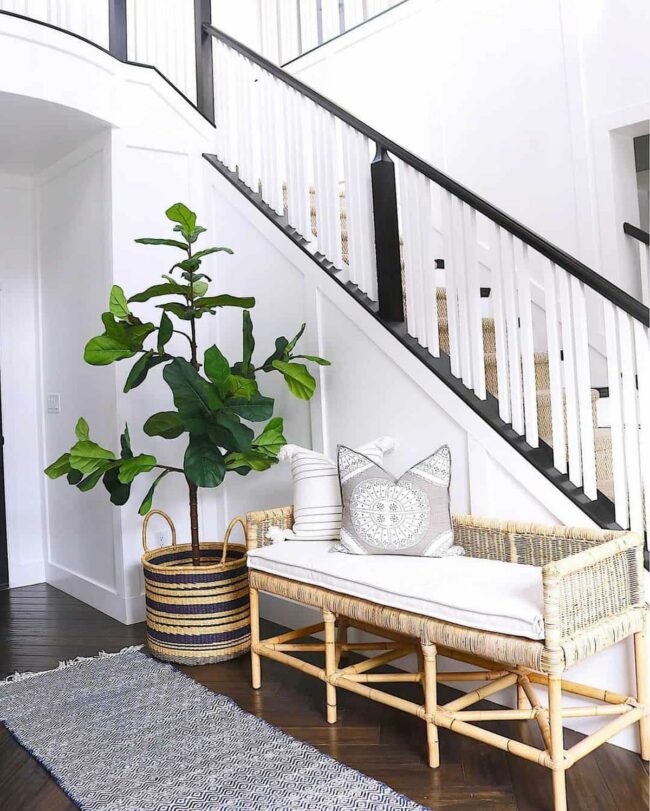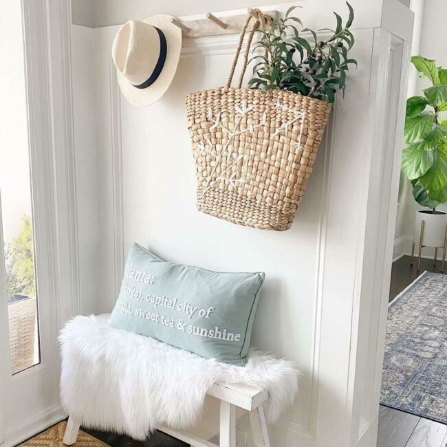 Rattan wall decor brings subtle texture and personality to the space, making the white front door feel like a gateway to comfort.