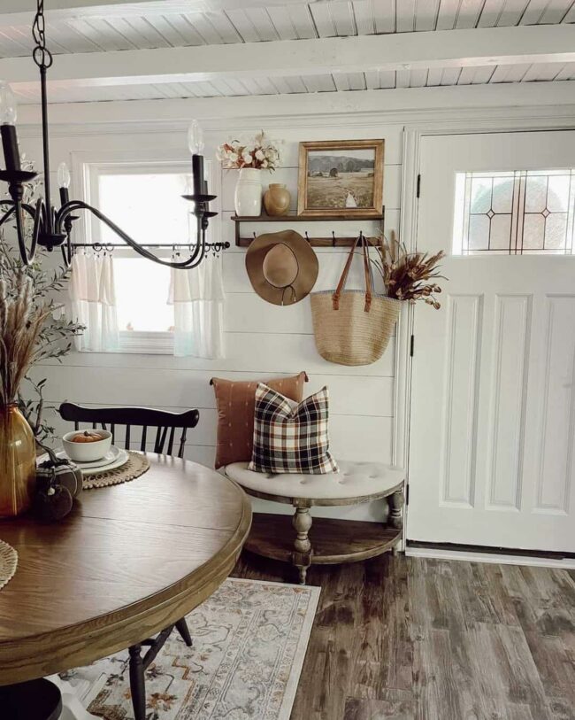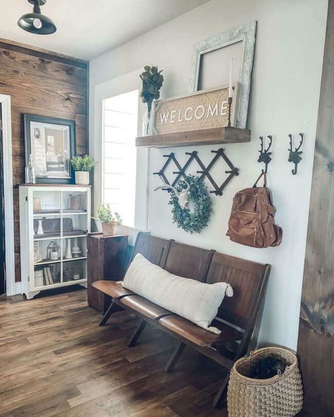 Rustic farmhouse charm shines in this welcoming entryway with a rich wooden bench that anchors the space.