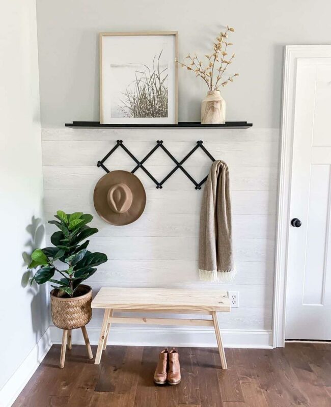 Elegant shiplap walls create a sophisticated backdrop for black coat hooks that blend style with purpose.