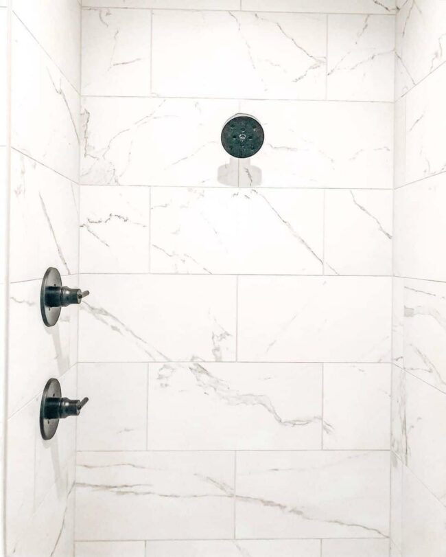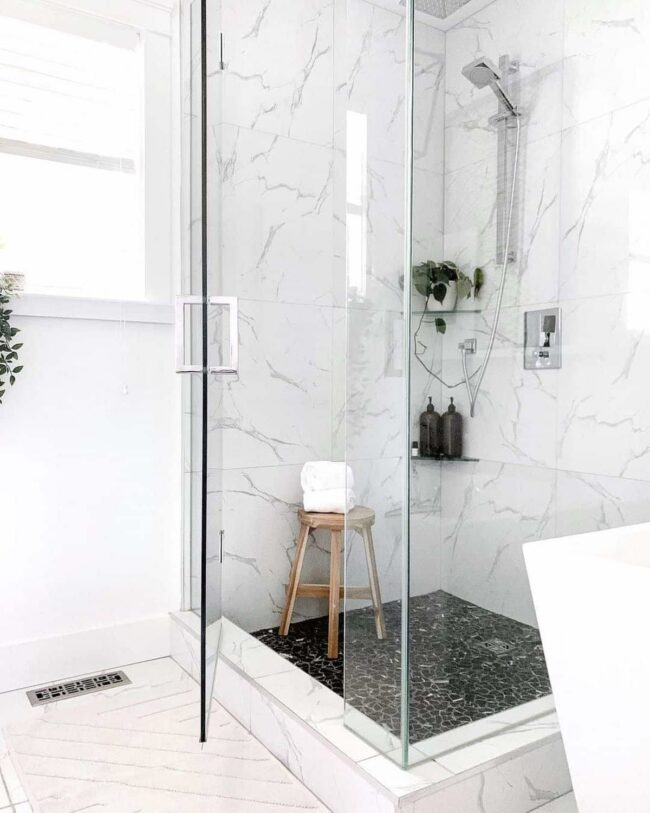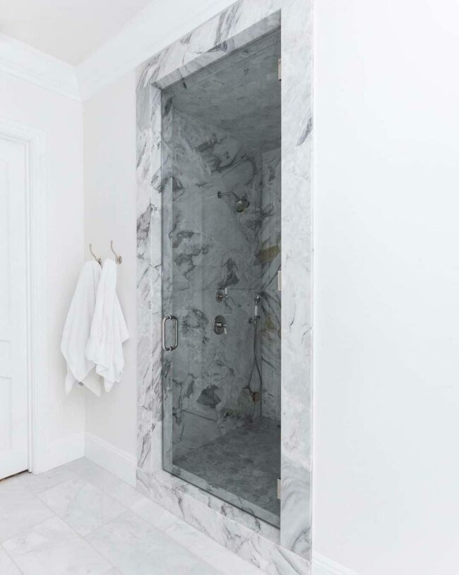 Marble walls with veiny tiles create a striking visual drama in shower spaces.