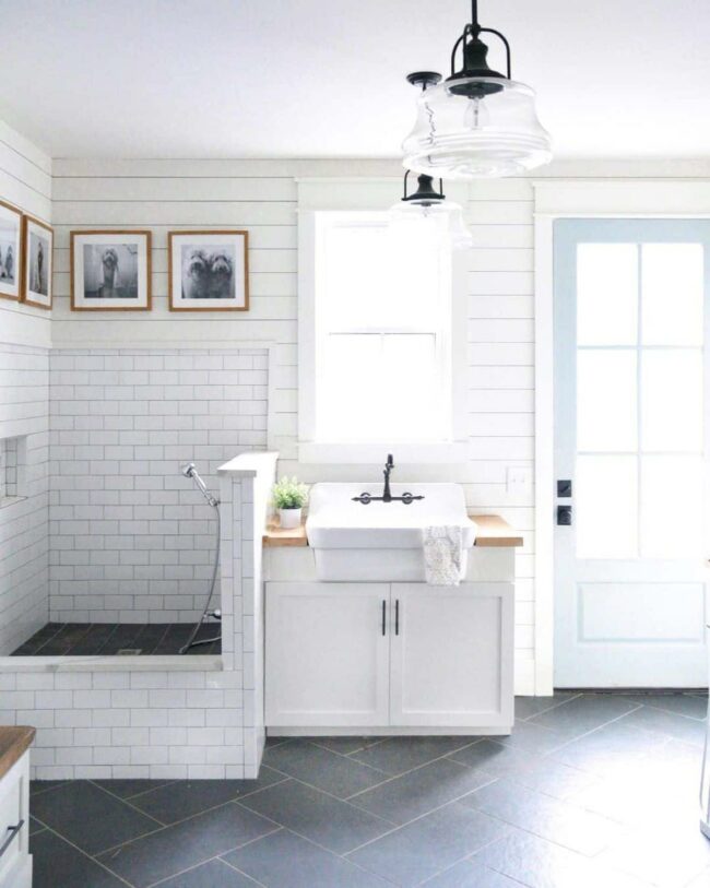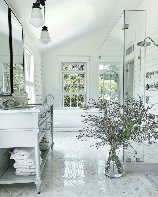 A farmhouse shower often combines vintage touches with modern convenience, resulting in a unique balance between old-world appeal and contemporary style.