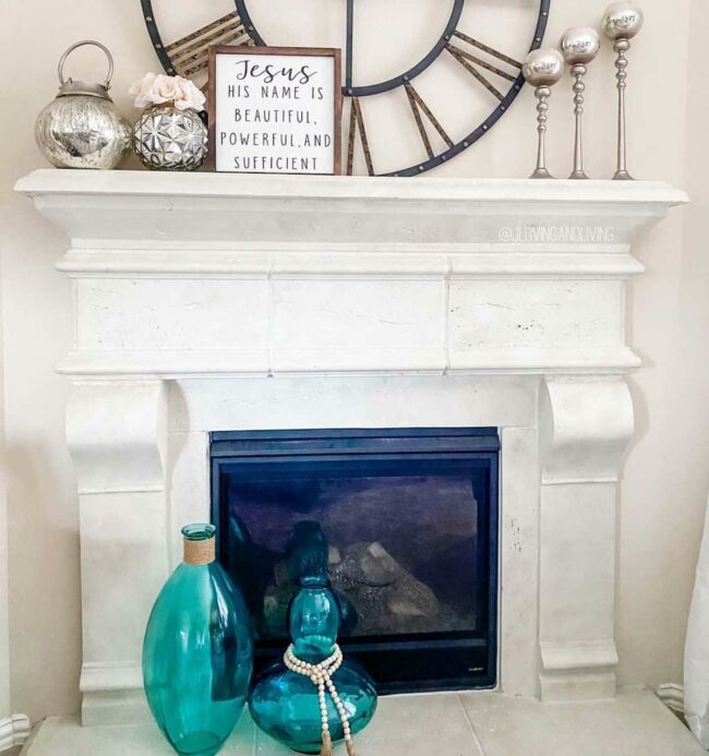 White fireplaces radiate rustic charm with wooden and turquoise elements that capture instant attention.