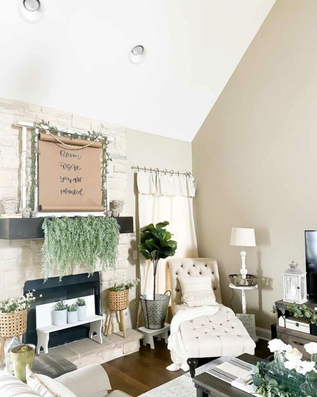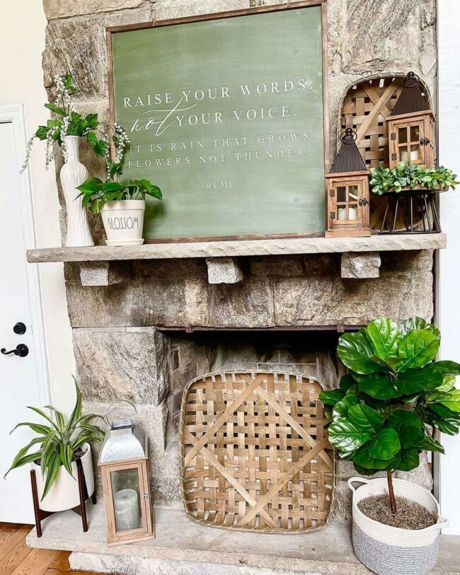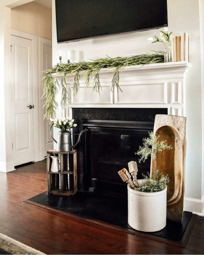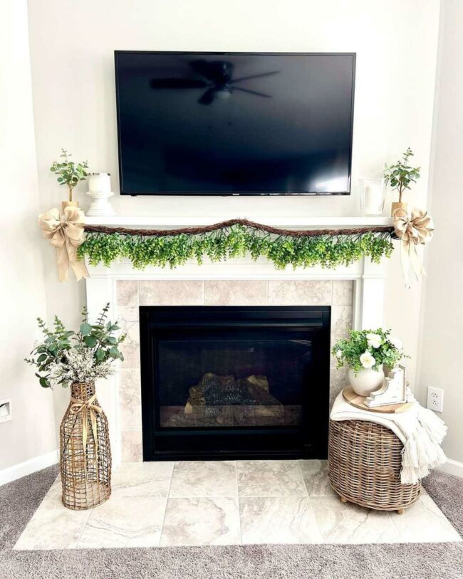Green plants cascading over the mantel introduce natural texture and vitality.