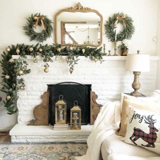 White, gold, and green dance together on this fireplace mantel, creating a magical holiday scene that captures your attention instantly.