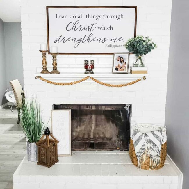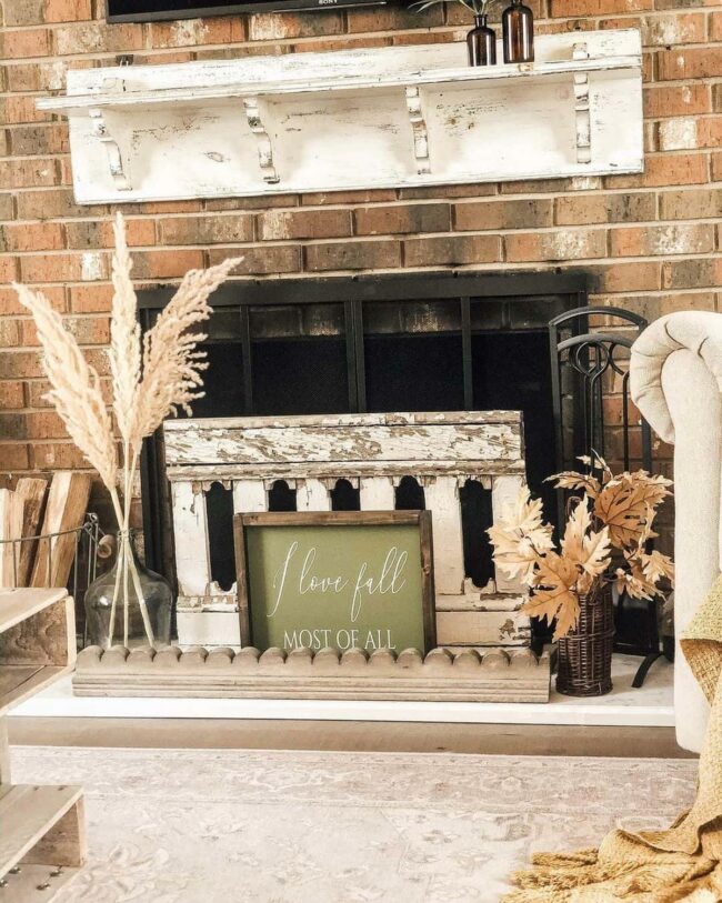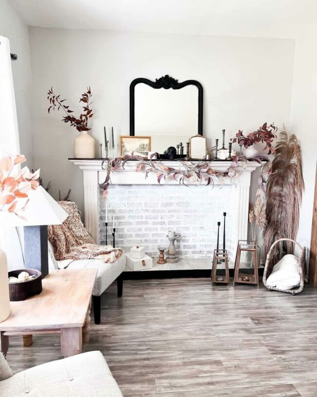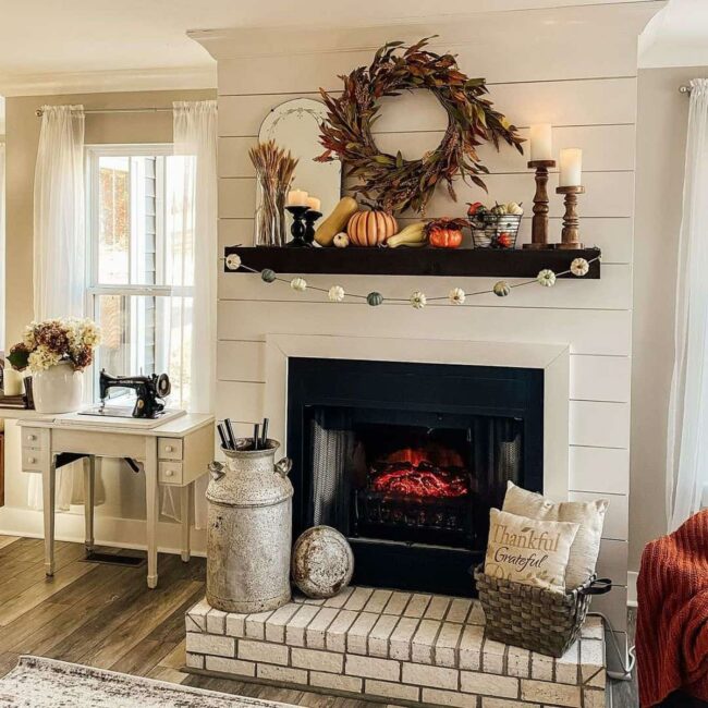 Seasonal tan farmhouse decor adorns the white mantel, adding elegant autumnal touches to the room.