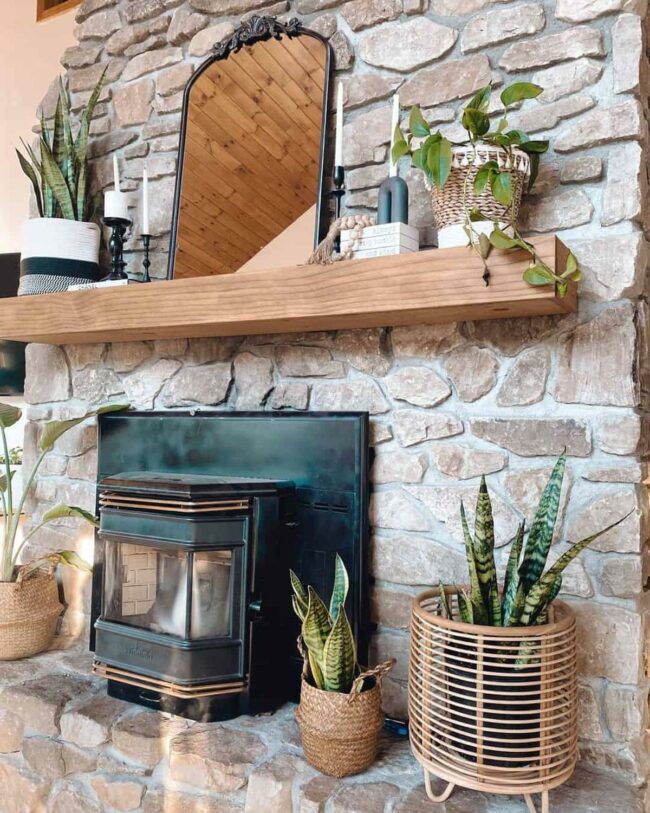 Wooden mantels showcase personal style through carefully curated candles and green potted plants, creating an inviting atmosphere.