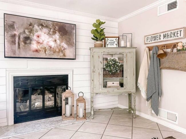 Charming garden wreaths and farmhouse frames beautifully decorate the mantel, creating visual intrigue for anyone entering the space.