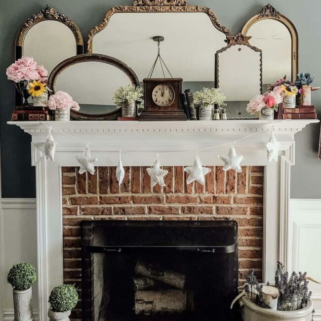 Silver-accented candles and an antique wall clock perch elegantly on the mantelpiece, delivering nostalgic farmhouse vibrancy.