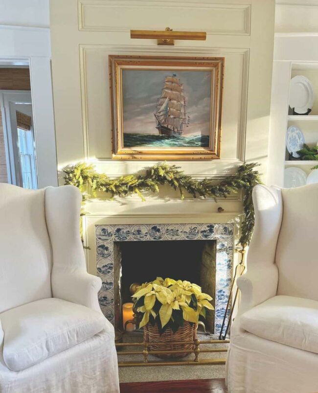 Green garlands drape softly across mantel surfaces, creating natural visual interest around maritime scenes.