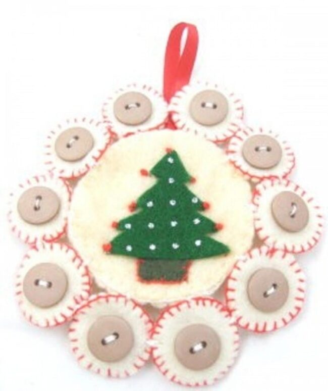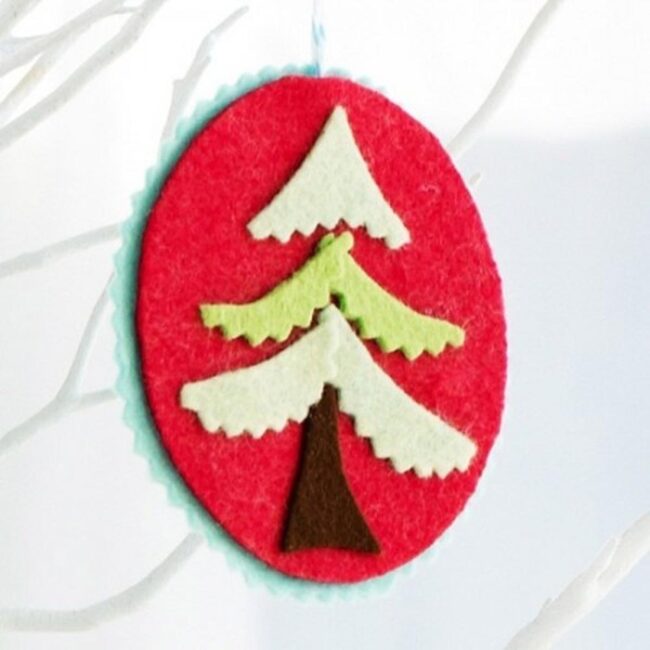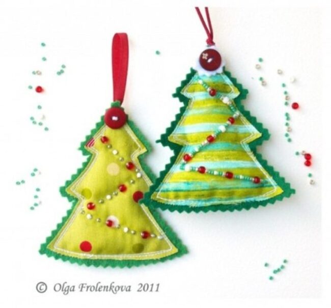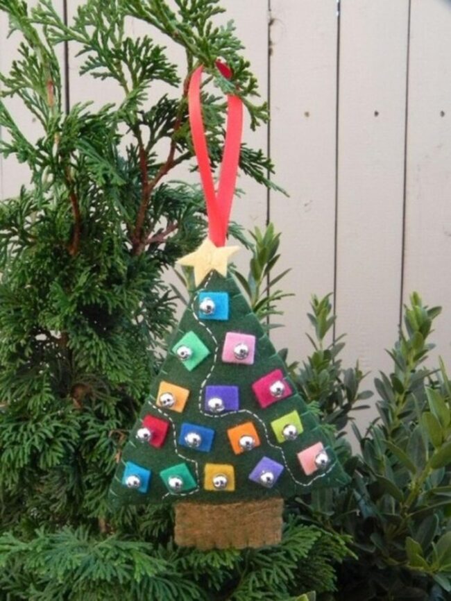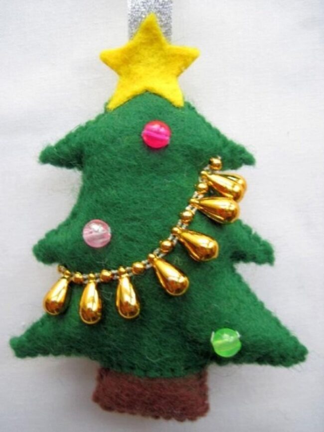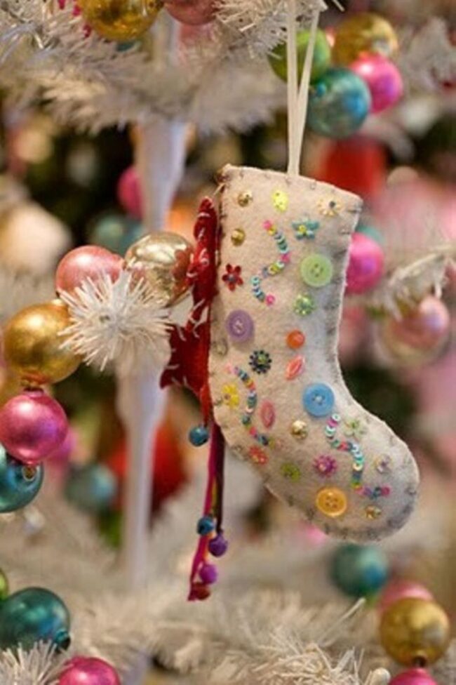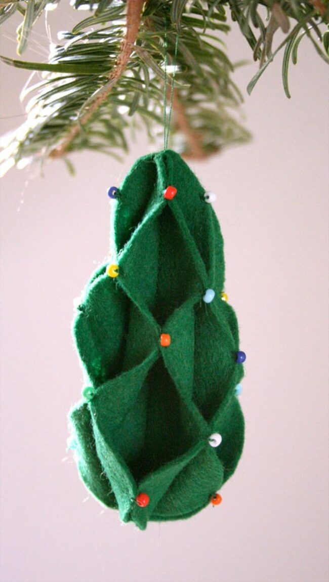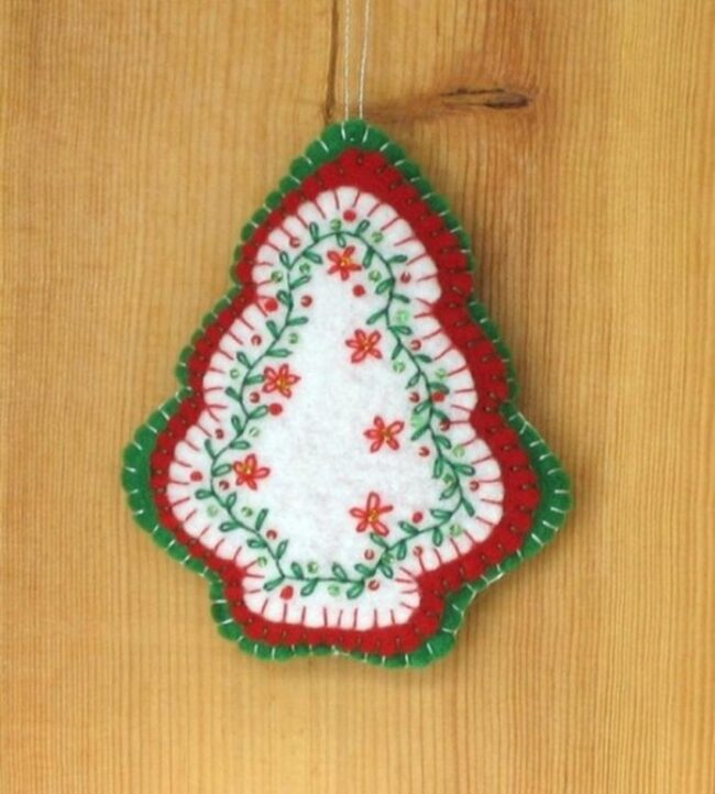 Holiday magic bursts from handmade ornaments when colorful details dance across soft green felt surfaces.