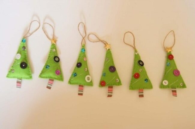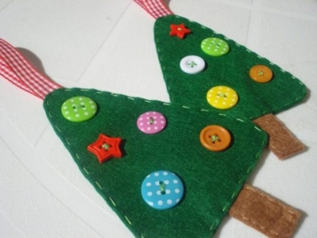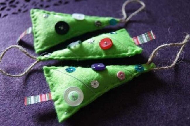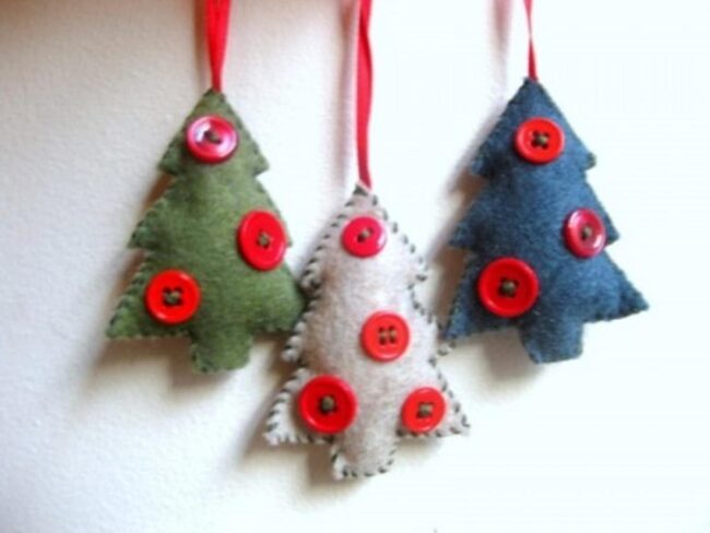 Handmade felt Christmas trees burst with holiday cheer, sporting charming red buttons that instantly catch your eye and spark joy.