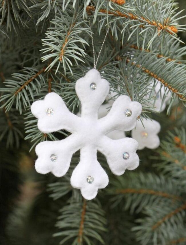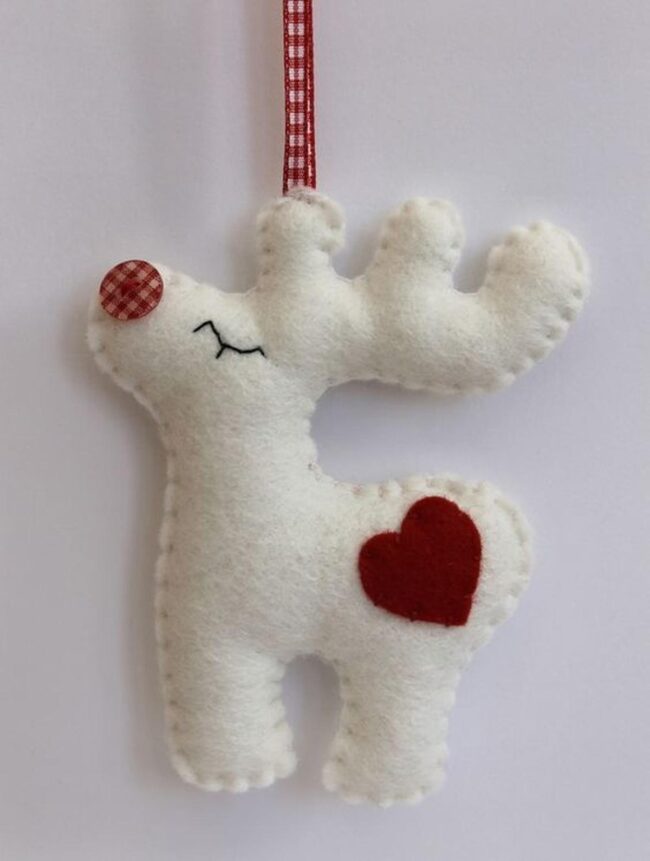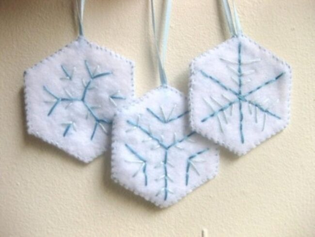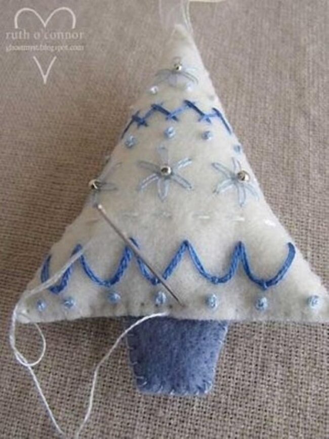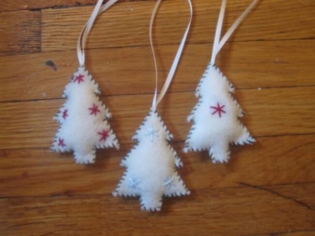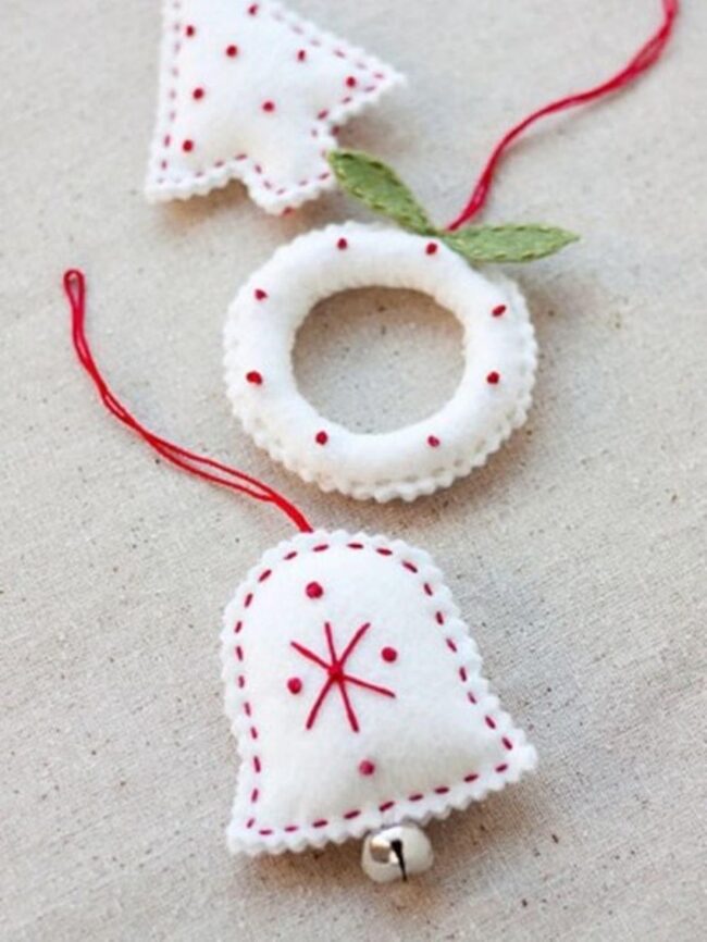 White felt holiday ornaments become magical personal treasures when hand-stitched with love and delicate details.