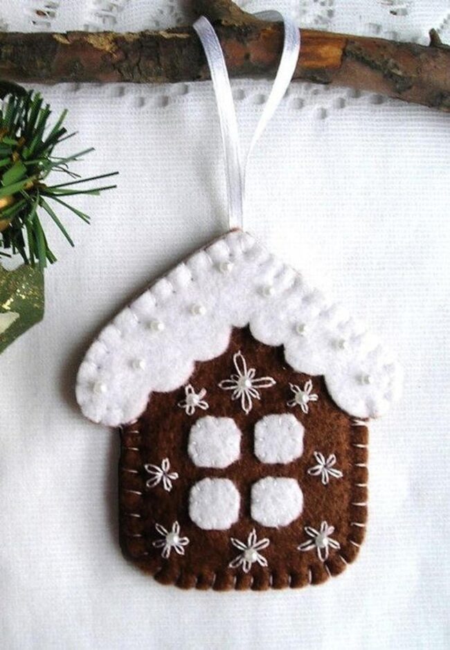 Soft white felt backgrounds showcase intricate details like sparkling beaded ornaments and carefully stitched windows that make each piece unique.