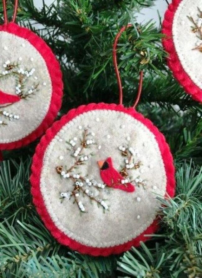 Delicate red thread carefully outlines each element, highlighting the meticulous craftsmanship that sets these ornaments apart from store-bought decorations.