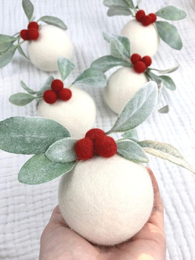 Soft felt materials offer a cozy alternative to traditional shiny ornaments, creating unexpected visual interest against stark white walls.