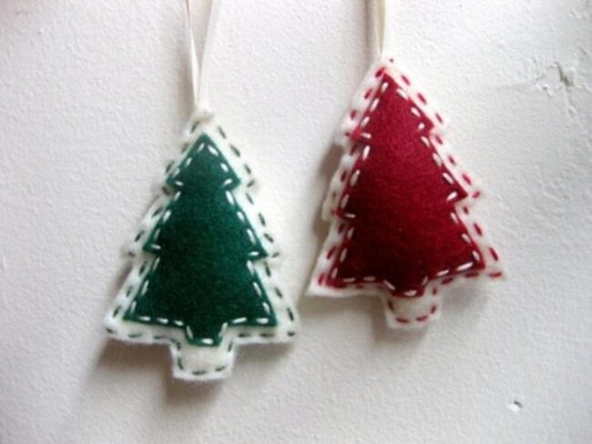 Handcrafted Christmas trees in deep green and red felt bring magical holiday spirit right into your personal space, with delicate white stitching that whispers of careful craftsmanship.