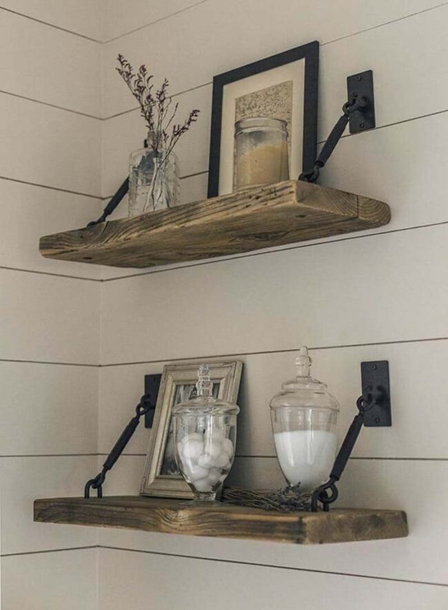Rustic shiplap shelving captures farmhouse elegance with its distinctive wood and wrought iron design, effortlessly elevating home decor.