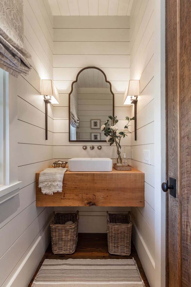Powder rooms become design powerhouses when shiplap transforms compact spaces into visual masterpieces.