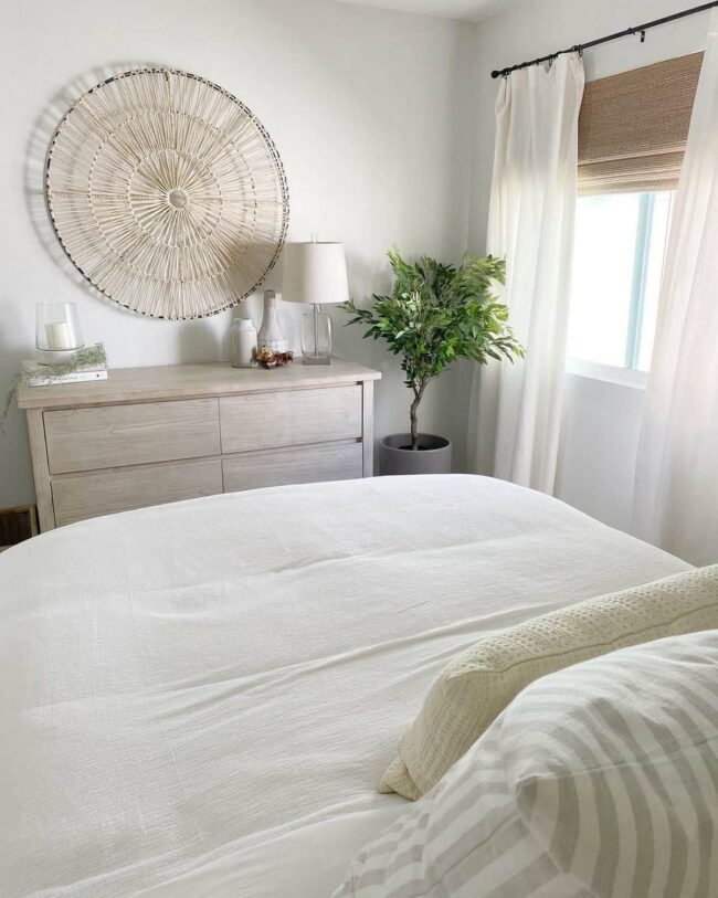 Woven basket wall decor brings instant boho charm to bedrooms, instantly elevating rustic farmhouse design.