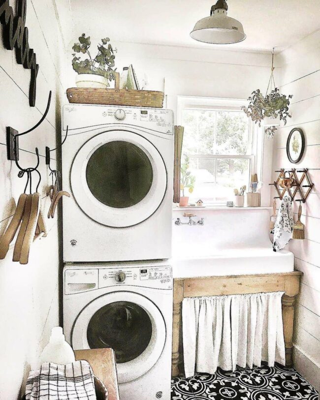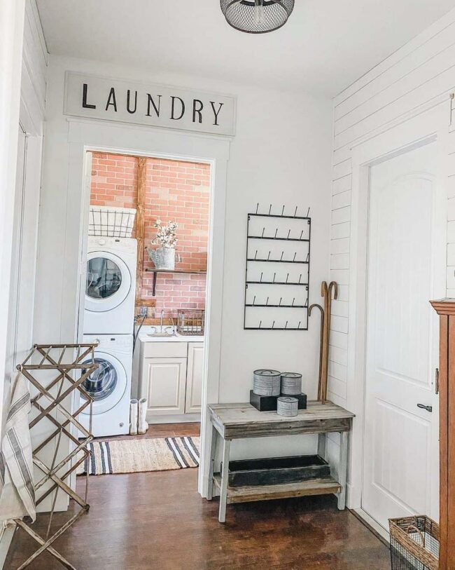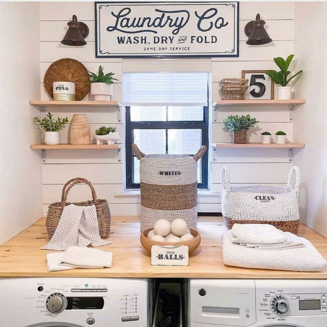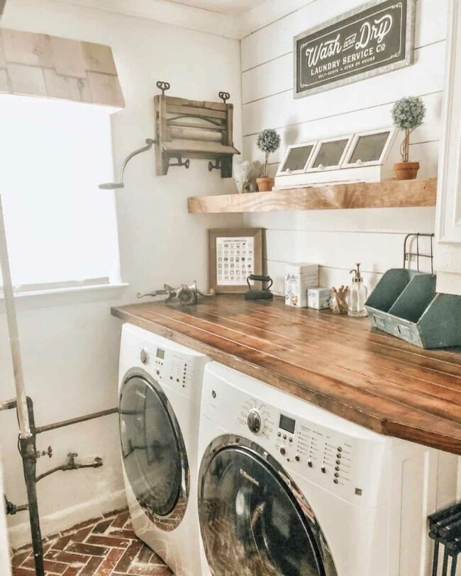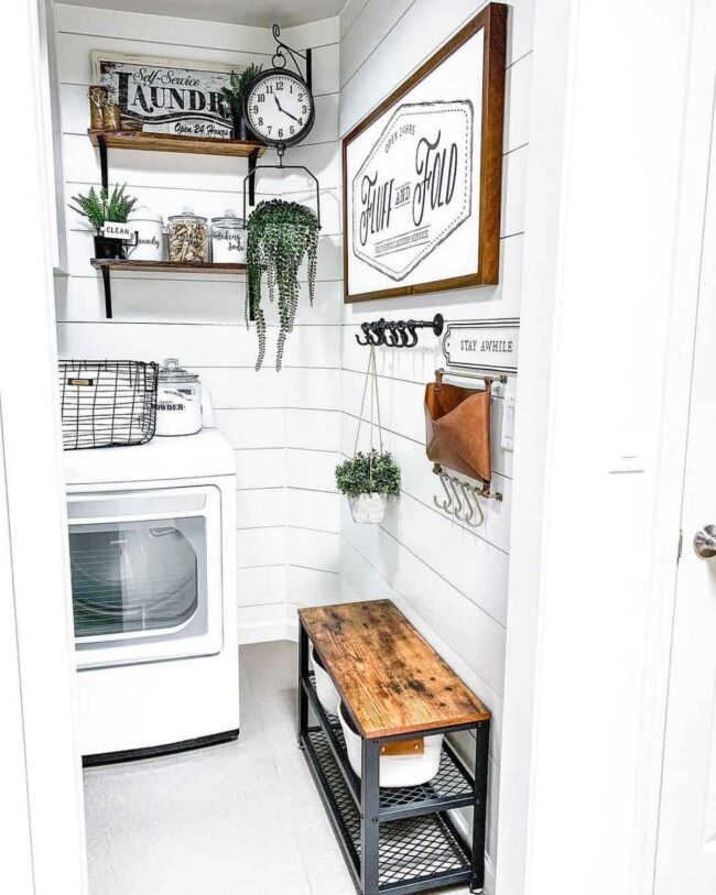 White shiplap walls instantly elevate a laundry room's charm and character.