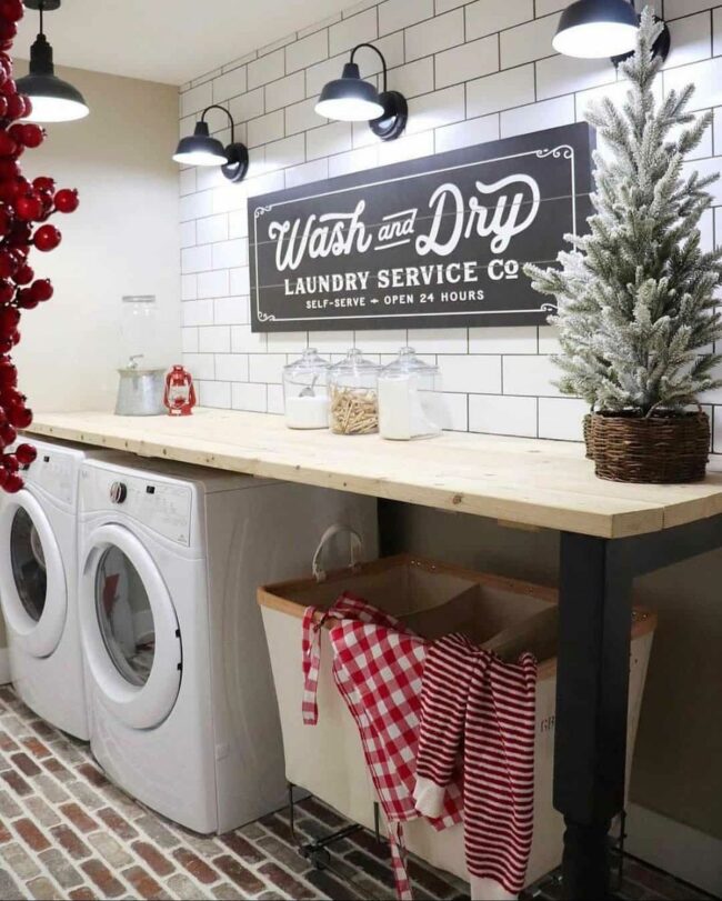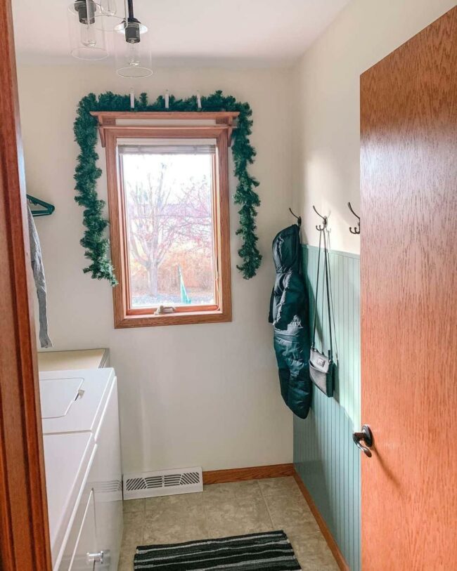 Garland drapes elegantly around the laundry room window, adding a delightful touch of warmth to the space.