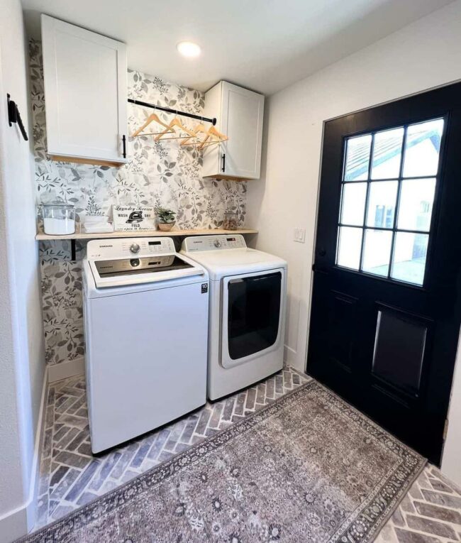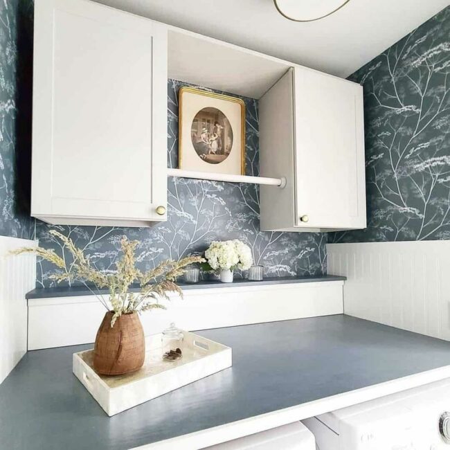 Crisp white shaker cabinets pop against elegant gray and white botanical wallpaper, instantly elevating this laundry room's design.