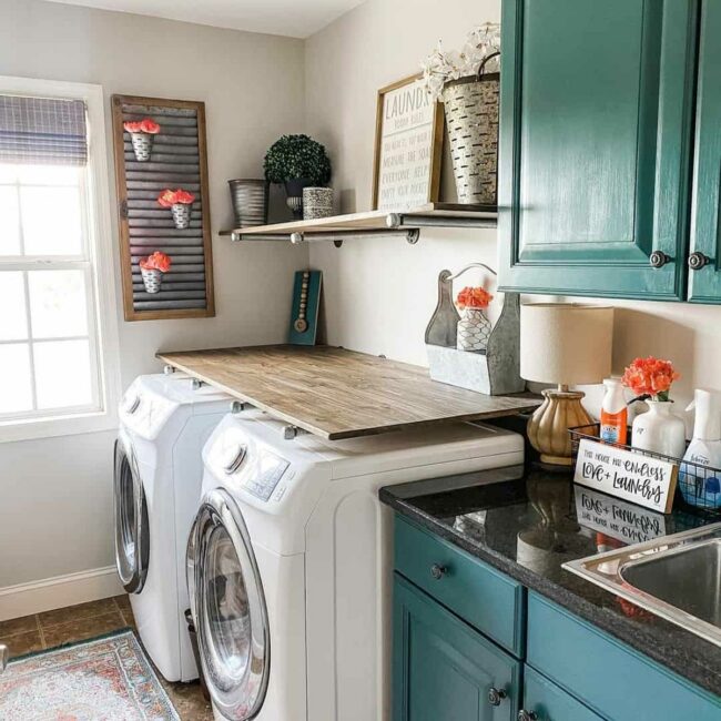 Sturdy wooden countertops cradle the washer and dryer, offering a perfect spot for folding clothes with ease.