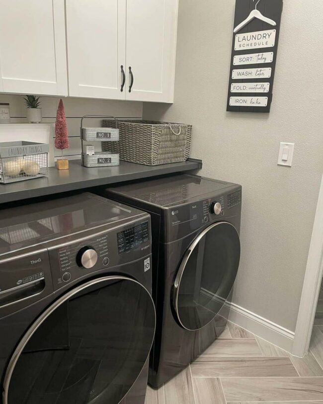Modern gray cabinets elevate this laundry room's aesthetic with smart storage solutions.